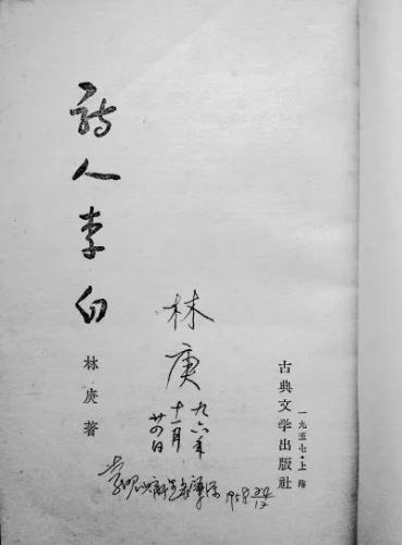1996年11月24日,我又在燕南园与林先生见过一次。为什么日子记得如此肯定、清晰?因为,那时我在摊上买到一本林先生早年的著作《诗人李白》。为1956年8月古典文学出版社初版,1957年9月第四次印刷的版本,印数51000。关于此书,后来林先生在信中曾告诉我,此书书稿和《中国文学简史》为文怀沙先生为“新文艺”(上海文艺联合出版社)所约,书名的书法也是文先生所写的。