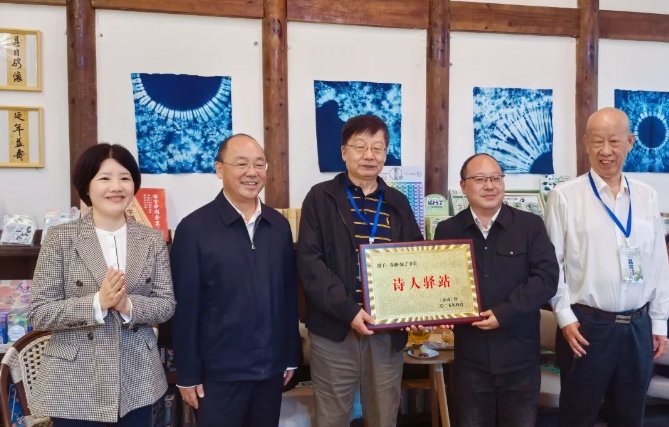 诗人们参观了广安建川博物馆聚落的老课本博物馆、搪瓷博物馆、川剧博物馆、“生活改变 1978—2024”博物馆、春融·知了书店等。《诗刊》社原主编叶延滨为春融·知了书店“诗人驿站”授牌,广安市政协党组书记、主席甘用德,广安市委常委、宣传部部长洪丽,四川省文化产业商会会长张建华见证了授牌仪式。
