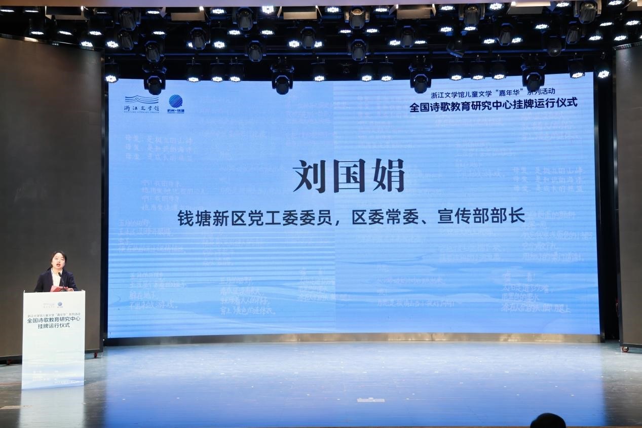 刘国娟在开场致辞中提到,诗歌和教育都是荡涤心灵、启迪人生的伟大事业。在新时代,诗歌理应成为思想教育的一把钥匙,诗教理应成为心灵教育的重要课堂。钱塘区文联、区作协在这两年多时间内,主动对接省市资源、凝聚作家力量、推动钱塘文学工作,举办各类文学活动和教育实践。本次活动及全国诗歌教育研究中心挂牌运行将成为钱塘新征程的起点,为中国诗歌教育做出贡献。