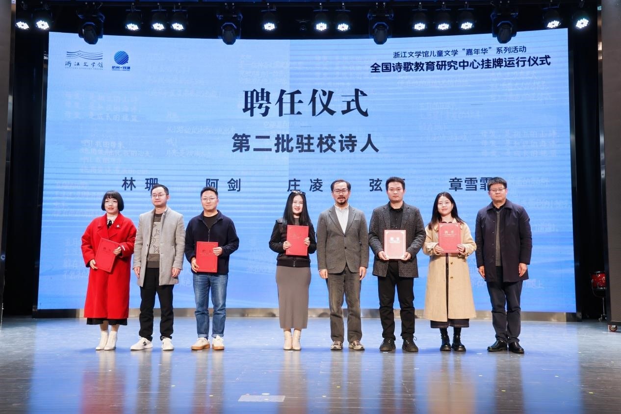 现场,青年诗人林珊、阿剑、庄凌、弦河、章雪霏,被聘为第二批驻校诗人,他们将把自己的诗歌创作实践带到学校,与孩子们一起探讨诗歌创作和阅读的快乐。观澜小学、江海实验学校、前进小学、下沙中学、新湾中学等学校被授为“第二批诗歌教育实践学校”。