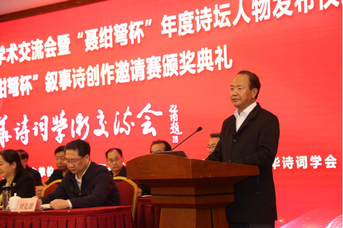 周文彰会长在发布会上发表讲话。他说,年度诗坛人物评选和叙事诗创作赛事都是以聂绀弩命名的。聂绀弩是我国著名作家和著名诗人,1903年1月生于湖北荆门,1986年3月在北京逝世。近几年,湖北省荆门聂绀弩诗词研究基金会联合中华诗词学会开展“聂绀弩杯年度诗坛人物”评选活动,活动的意义可概括为6个字:肯定、激励、推动。一是对在诗词研究与创作中取得突出成就的当代学者和诗人予以充分肯定,评选坚持公平公正,评选出来的年度人物,都是知名度高、学术和创作水平高、认可度高的学者和诗人。二是激励更多的学者和诗人研究诗词、创作诗词,形成长江后浪推前浪、一代更比一代强的诗坛盛景。三是推动中华诗词的发展和繁荣,践行习近平文化思想,助力建设属于我们这个时代的新文化。希望仍然处在创作研究阶段的年度人物,以此作为起点,再接再厉,在诗词研究和创作方面更上一层楼。周文彰说,湖北省荆门聂绀弩诗词研究基金会成立以来,除了评选诗坛年度人物,还主办或支持主办了中华诗词学术交流会,编辑出版《心潮诗词》杂志,编辑出版《当代诗坛百家文库》,连续9年承办大学生中华诗词邀请赛,从去年起又发起叙事诗创作邀请赛。这些活动的意义远远超出了活动本身,对当今诗词的繁荣发展,无论是在营造氛围方面,还是在实际效果方面,都发挥了独特作用。最后,周文彰对荆门市委市政府及相关企业对中华诗词事业的大力支持和对本次活动的高度重视表示衷心感谢。