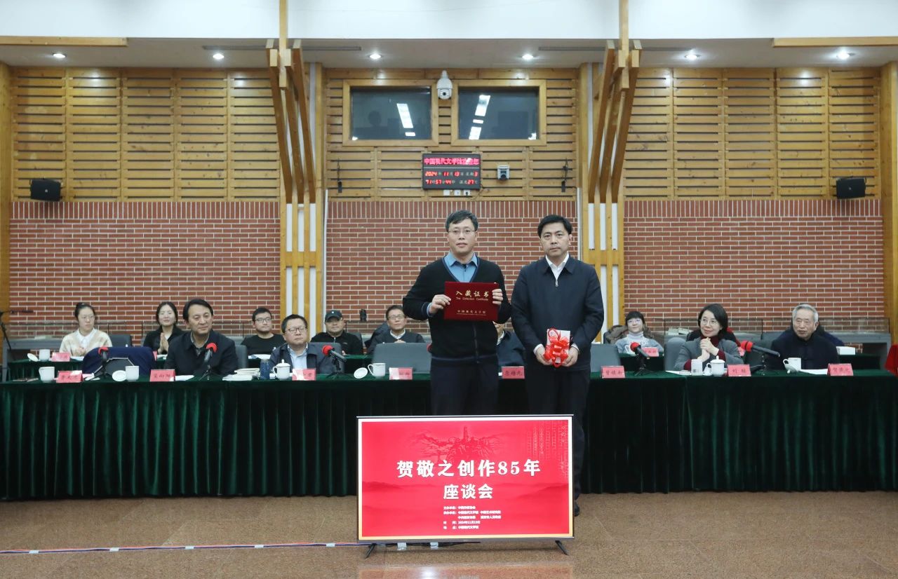 座谈会现场,鲁太光代表贺敬之向中国现代文学馆捐赠了《贺敬之诗歌精选》。中国现代文学馆常务副馆长王军代表文学馆接受捐赠,并颁发入藏证书。