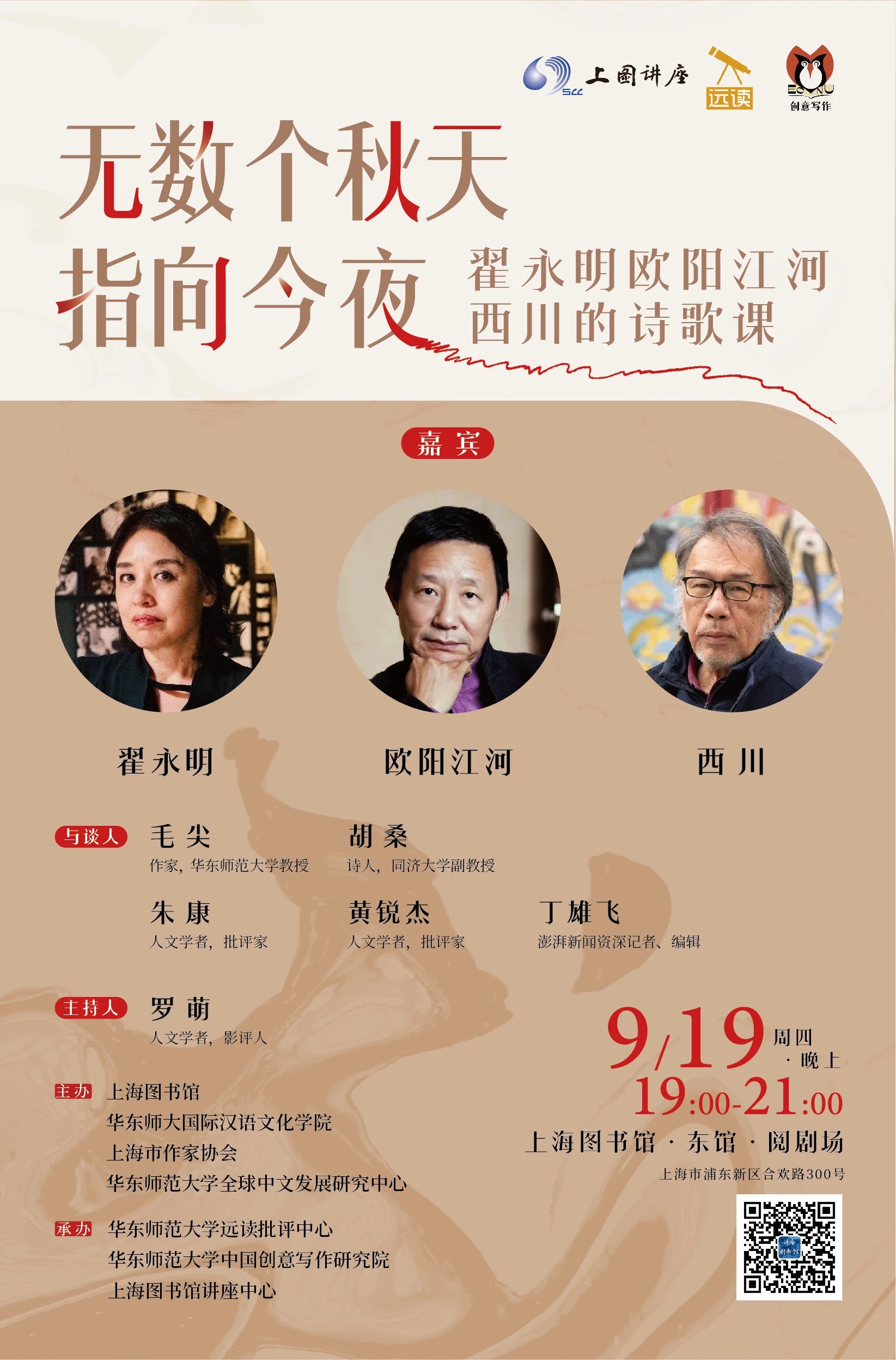 这一刻,翟永明、欧阳江河、西川,深居“写作的秋天状态”的三诗人,“在词与物的广泛联系和精微考究的幽独行文之间转换”的三位伟大诗人,将身临上海图书馆东馆。