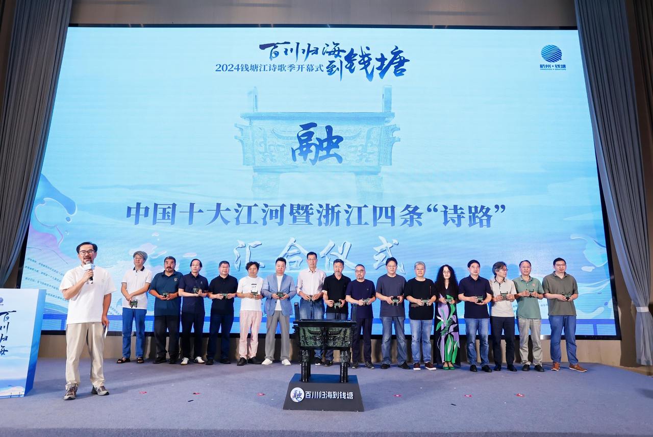 八月底,杭州钱塘江边,来自省内外的30多位著名诗人、学者,将来自长江、黄河、珠江、雅鲁藏布江等全国十大河流的水、代表浙江四条“诗路”的水,倾倒入钱塘江中。这是“百川归海到钱塘·2024钱塘江诗歌季”开幕式上“融·中国十大江河暨浙江四条‘诗路’汇合仪式”的后续——“融水入江”。