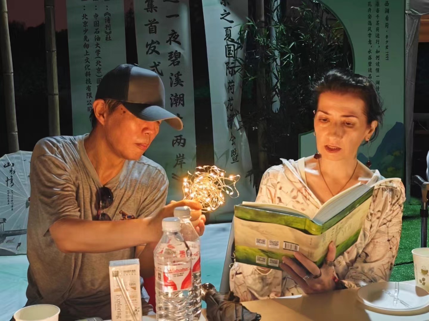 8月3日傍晚,“北京之夏国际荷花诗会”暨《这一夜碧溪潮生两岸》新书首发式在红领巾公园湖心岛成功举办。在湖畔,诗人们徜徉于莲叶间,伴着蝉鸣和烛光,共同回忆那个诗意盎然的八十年代。诗集作者西渡、陈均、张子选,以及《诗刊》社主编李少君,中国人民大学世界民俗文化研究所所长、画家遂岩,中国作协网络文学中心副主任、评论家北乔,新疆作家协会原副主席狄力木拉提·泰来提,俄罗斯诗人、译者伊琳娜,俄语译者、北师大留学生李莎,诗人、艺术家、虞山当代美术馆馆长张维,诗人、编剧、珞珈诗派创始人之一陈勇,中国诗歌学会新媒体部主任安琪,中国水利作协副主胡金华,北京鸿儒文轩文化传播有限公司董事长崔付建,中国青年出版社文学编辑中心主任侯群雄、人民武警出版社编辑董庆月、北京鸿儒文轩编辑秦国娟,中国诗歌网副总编符力等出席活动。