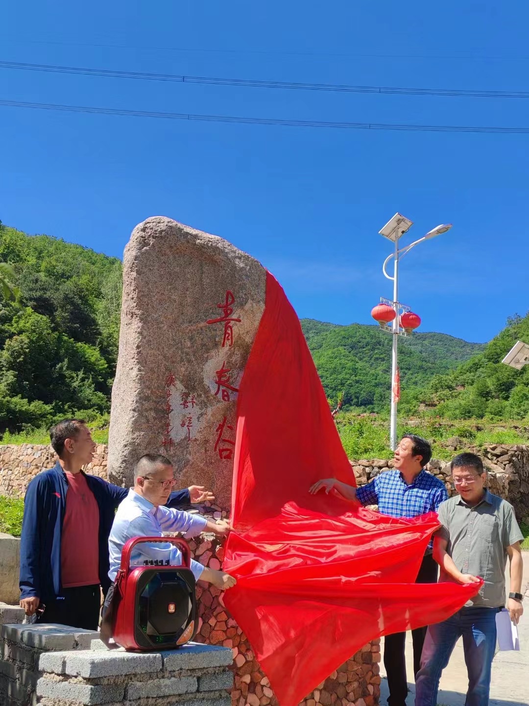 随后,李少君、刘福君、王晓笛、王琦共同为由著名诗人舒婷题写的“青春谷”石碑揭幕;接下来,王晓笛声情并茂地朗诵了舒婷的名作《致橡树》;诗上庄的少年儿童们用稚嫩、清亮的声音齐诵了刘章先生的代表作《牧羊曲 牧场上》;五位女村民感情饱满地清唱了由刘福君作词、著名音乐家王立平作曲的村歌《诗上庄》。活动在一片欢快的气氛中圆满结束。
