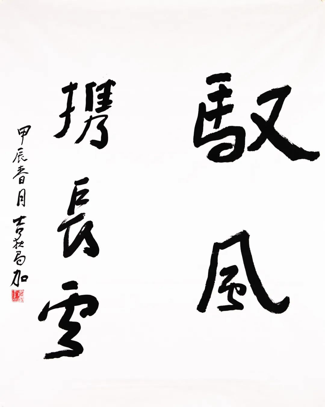 从吉狄马加的书画创作中,我们可以看到他如同其诗歌般的宽阔。他的书法和绘画创作承载着彝汉文化的博大,也展现了他作为书家对于汉字美学的追求和表达。他遵循着传统书法规则的同时,注入自己的个人心性与创造,使得他的书法作品既有传统意蕴,又不失现代的精到,审美风格独到。记得那一年,当我看到村上有一的书法,我说“村上是现代探索型书法的终结者”。之所以说是“终结者”,因为书法无论怎么变,其作为文字的可读性不能变,不然就是绘画了。而村上有一的拓展已经逼到了书法的临界处,也就是说村上已经为此类书法界定了一条线,那条线即是:此路已不通,请另辟蹊径。也是从那时开始我有意无意的为书法划分了两个类别——创新型与集大成型。村上显然属于前者,吉狄马加为后者。