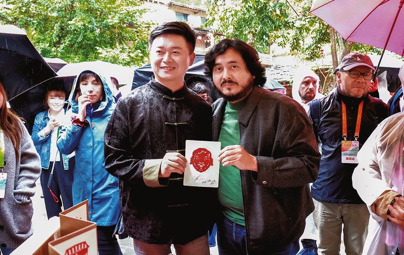 循着歌声徐徐前行,不远处的洛南剪纸摊前,各式各样的脸谱铺满桌面,红纸在艺人石晶的指尖翻飞,剪刀开合间,一个人物脸谱便跃然纸上。巴拿马诗人哈维尔·阿尔瓦拉多端坐摊位前,面带微笑,满怀期待地盯着艺人的双手,不一会儿,哈维尔·阿尔瓦拉的面容在红纸上逐渐显现。