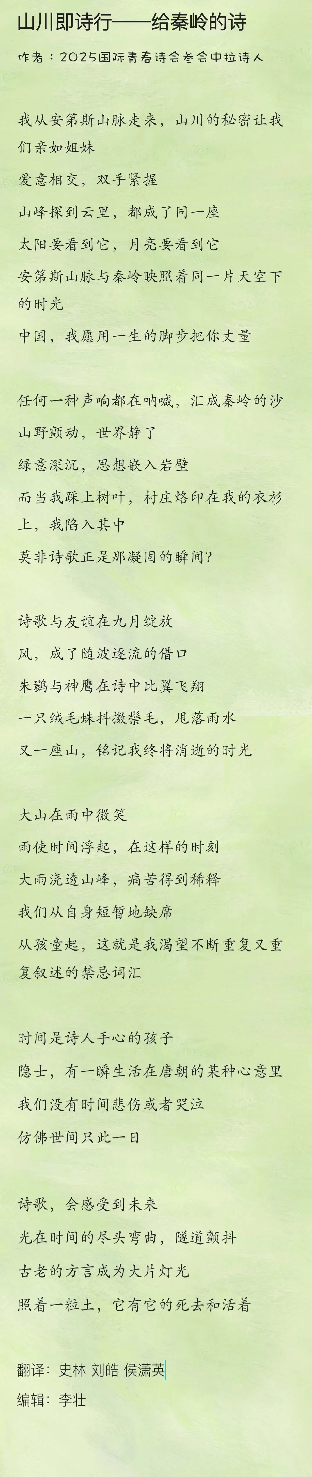 9月17日,参加2025国际青春诗会(中国—拉美国家专场)的中拉诗人深入秦岭腹地。在和合南北的秦岭,他们用各自的语言为秦岭写了一首诗: