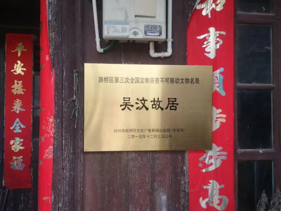今年暑期,我回到路桥老家避暑,恰逢路桥作协主席六月雪组织“走进诗人吴汶故里”活动,作为特邀顾问,我和诗人南野有幸见到了吴汶的后人,并读到他们保存的吴汶诗稿和自撰年表,这些都是极为珍贵的历史资料。吴汶故居建于清末民初的海塘上,院落前的李树,花开花落;原为“三台九明堂”的院落,现在只剩下“一进”,门口挂着十年前路桥文广局颁发的“第三次全国文物普查不可移动文物”铜牌(下图)。