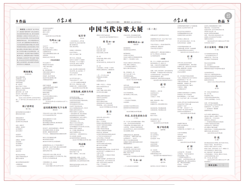 从黄遵宪“我手写我口”、梁启超“诗界革命”以及五四新文化运动的明确加持以来,有关汉语新诗的探索、实践至少历时125年以上,迄今不仅自成传统,而且已成为汉语诗歌创作的主流。当代中国新诗如大江大河,由人类精神的天际奔涌而来,尤其适逢便捷的微信传播,诗人的创作热情空前高涨,流派清浊裹挟,作品浩如烟海,因此披沙拣金、进行选择,成了《作家文摘》义不容辞的责任。我们计划每月一期,藉《中国当代诗歌大展》的名义,试图逐渐勾勒当下新诗创作的脉络,虽然难步“野无遗贤”的极致,但也向往百花齐放的繁华盛况。相信,我们的努力,会在读者与作者的共同参与中,渐趋成熟。