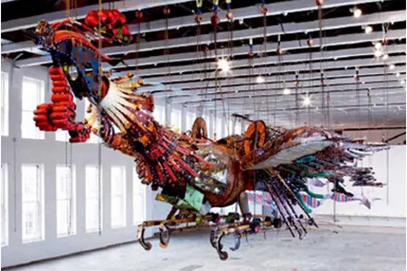欧阳江河:《凤凰》是我在美国曼哈顿的时候写的,它源于我的艺术家朋友徐冰的一个装置作品。他发布于2010年的《凤凰》(下图),是一个5吨重的鸟,最初来自一个订单。但他用北京“财富大厦”的建筑废料——安全帽、工具刀、搅拌器等——造了一个纪念碑式的作品。在这过程中我基本上都参与了,我当时就觉得很受打动。上世纪60年代初,法国有一个获诺贝尔文学奖的诗人圣琼·佩斯,曾经受政府委托为一个“鸟”的装置艺术写过一首诗。当然,《凤凰》的写作和委托无关。如果说,徐冰在他的《凤凰》里处理了比如财富大厦与劳动者的关系,资本的关系,词与物的关系等20世纪的复杂经验,我则试图将异质的材料放在一起,整合与重塑当代图景,反思21世纪人类的生存境遇。