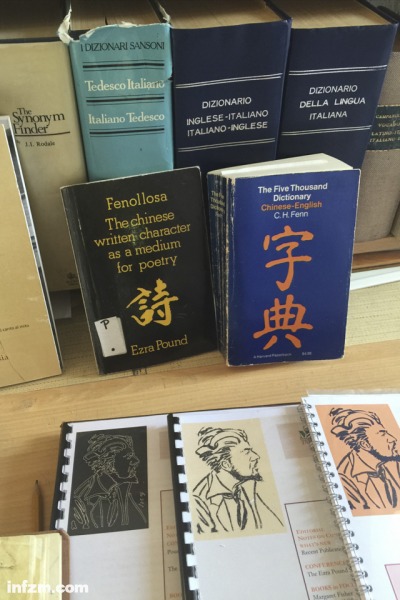 玛丽带着我们参观城堡,一边走一边解释遍布在城堡中庞德生前的各种收藏、雕塑、手迹、书信、书籍和照片,其中包括庞德和叶芝、艾略特、乔伊斯等人的书信往来和照片,以及他翻译《论语》和中国古典诗歌时学习中文的笔记和词典,还有《诗章》的部分章节。玛丽把《诗章》称为她的“圣经”。
