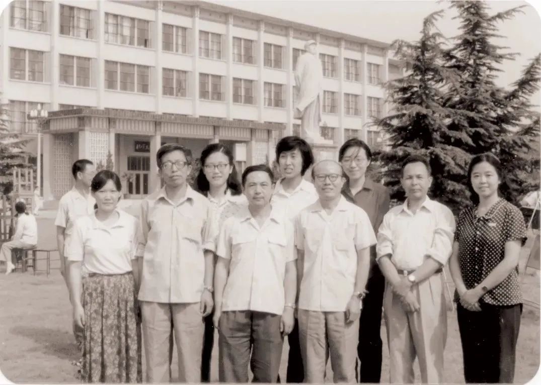 图七:1970年代末,谢冕与同事、学生在北大图书馆前合影
