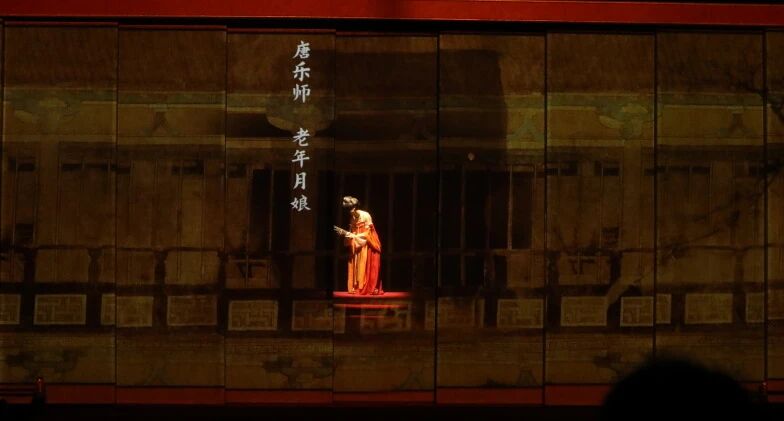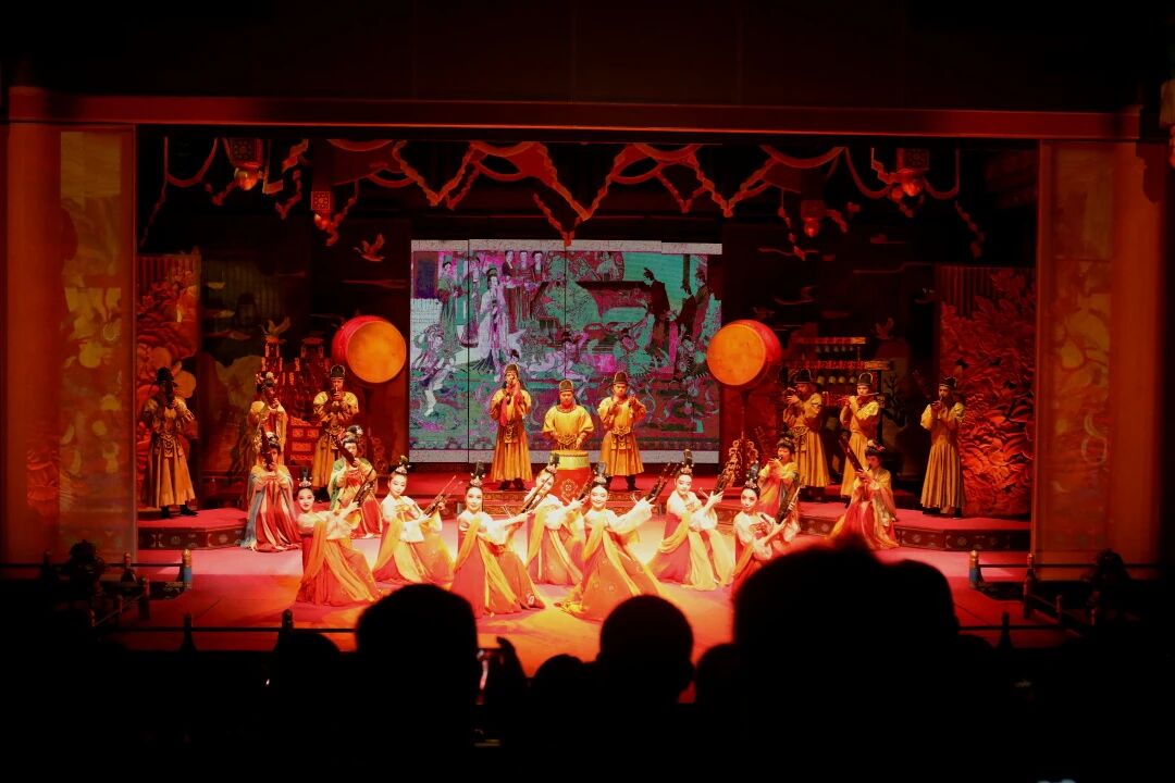 西安鼓乐被誉为“中国古代音乐的活化石”,其历史可追溯至隋唐时期的宫廷燕乐。2009年,西安鼓乐被列入联合国教科文组织人类非物质文化遗产代表作名录。东仓鼓乐社是西安鼓乐代表性表演社团之一,创新性地将非遗艺术与全息投影技术相结合,给观众带来无与伦比的沉浸式体验。流云飞鹤的电子帷幕宛如薄纱,身着华服的乐师们于幕后渐渐显影,分持笙笛竽箫、阮琴锣鼓等乐器缓缓起势,乐音渐起,听者无不陶醉在大唐宫廷燕乐的典雅悠长中。