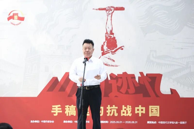 为纪念中国人民抗日战争暨世界反法西斯战争胜利80周年,缅怀抗战英烈、弘扬抗战精神,9月1日,由中国作家协会主办的“山河迹忆——手稿里的抗战中国”展览在中国现代文学馆开幕。中国作协主席、党组书记张宏森在开幕式上致辞并宣布开展。中国作协党组成员、副主席邱华栋主持开幕式。中国作协党组成员、书记处书记胡邦胜、李一鸣、何向阳,国家文物局革命文物司副司长彭跃辉,中宣部文艺局理论文学处处长刘涛等出席开幕式。