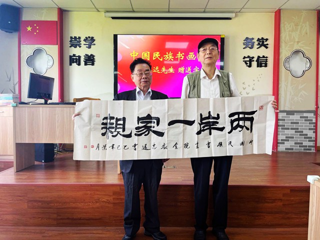 中国民族书画院副秘书长金志远赠给台湾中国文艺协会字幅:《两岸一家亲》