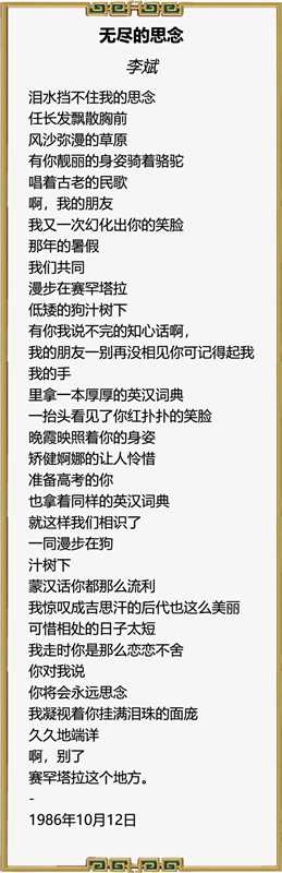 李斌,1967年8月12日生人,老家南大勿登村,自幼家贫苦学考住交通部呼和浩特交通学校,分配集宁市政工作十五年后调到集宁市交通局工作至今,未有建树,唯一爱好写诗,至今已不下千篇从未发表只当日记而已自看自乐自鸣自回忆,感悟人生悲欢离合也挺有意思!